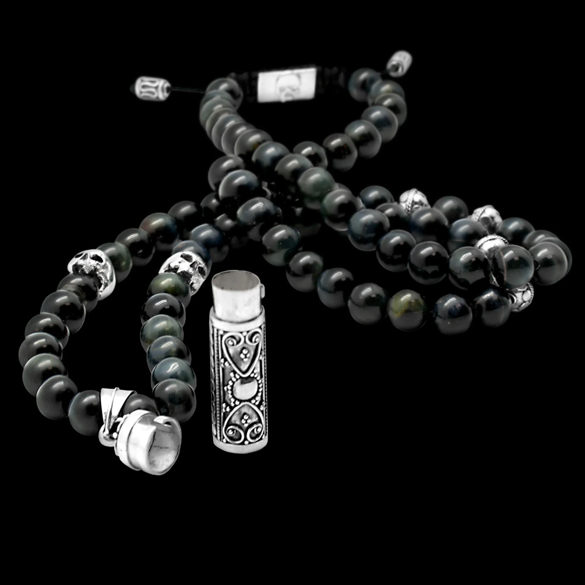 Nous avons choisi d'utiliser l'oeil de faucon, pierre chatoyante aux reflets allant du bleu au vert aussi connue par les Egyptiens sous le nom de pierre d'Horus.