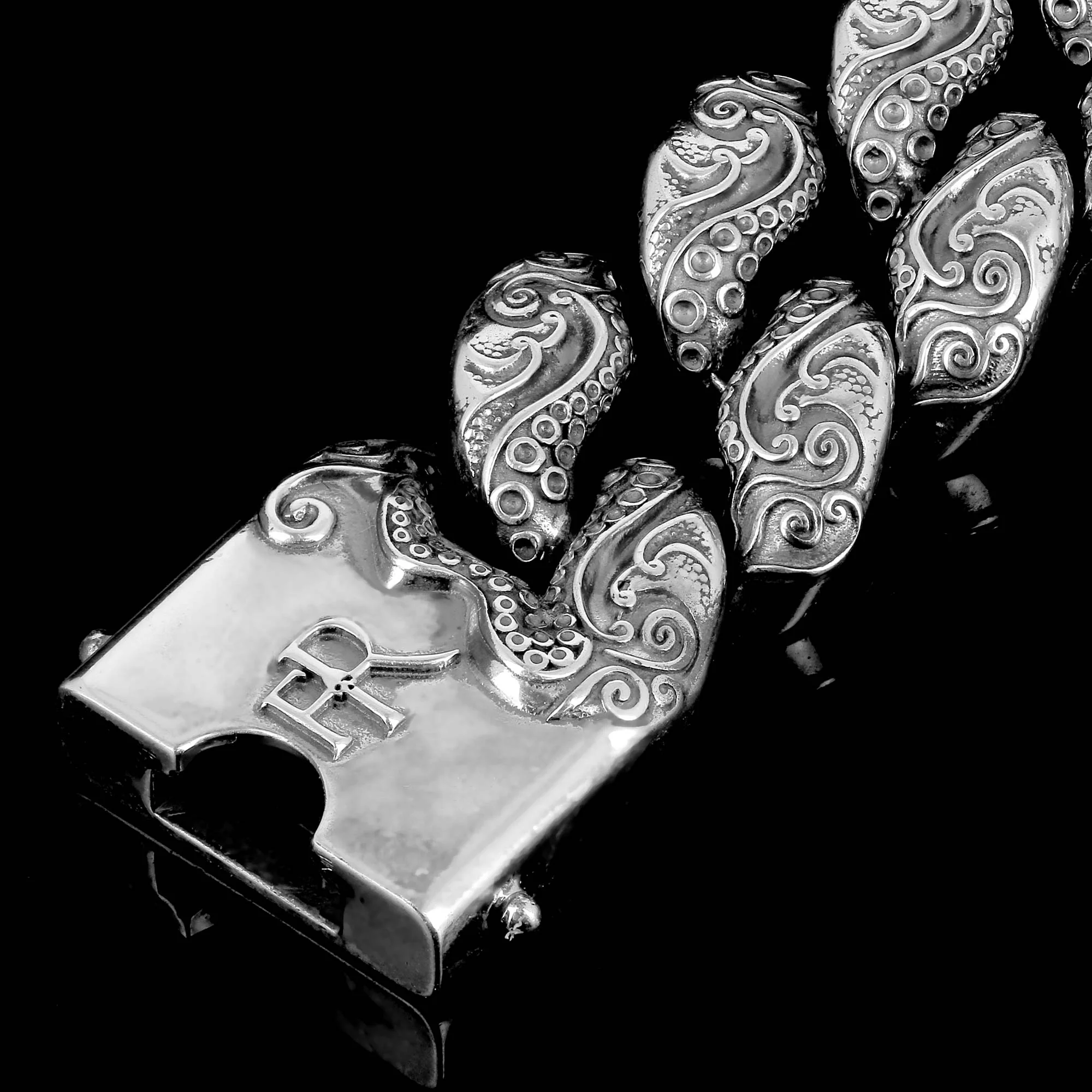 Bracelet en argent 925, hommage à la créature légendaire, avec ses motifs tentacules et marins. Fermoir invisible sécurisé.