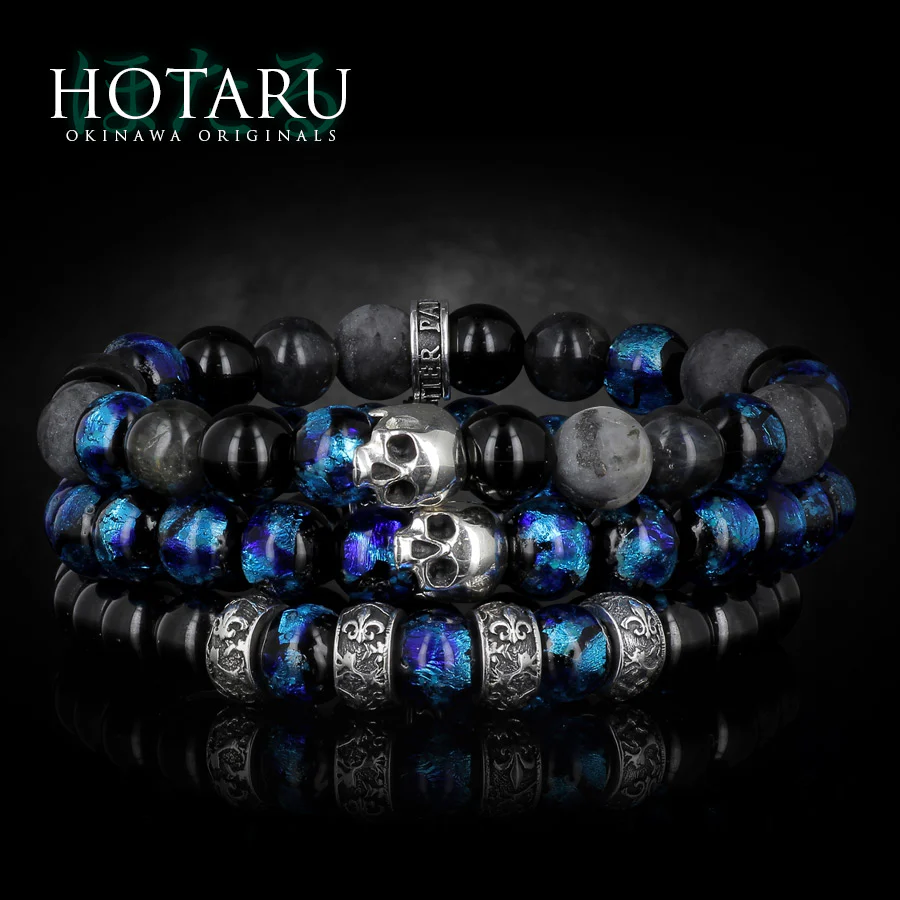 Notre meilleure vente; le bracelet Abyss Wrap, revu avec nos superbes perles traditionnelles Hotaru® d'Okinawa. Sobriété et élégance mais toujours avec style pour ce bracelet associant les teintes de noir au bleu en passant par le gris. Monté sur un élastique pour un enfilage rapide et facile et terminé par notre rondelle et notre skull Flibustier Paris en argent patiné et quatre perles en argent de Bali.